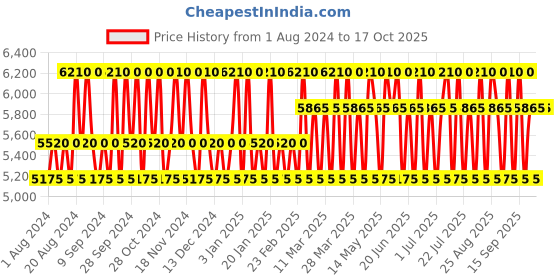 The current price is ₹5,865, which is ₹690 (13.3%) higher than the best price of ₹5,175 last seen on 1 Aug 2024. Over the 441 day price history period, prices have ranged from ₹5,175 to ₹6,210, with an average of ₹5,632. The pricing shows moderate volatility, but the overall trend is concerning as prices are getting more expensive. In terms of recent activity, there have been 0 price changes this week, 1 this month, and 69 over the past year. Consider waiting before making a purchase as prices are rising and better deals may be available later.