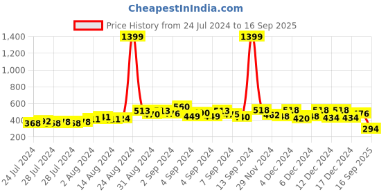 Good news! The current price of ₹294 is at its best ever level. Over the 419 day price history period, prices have ranged from ₹294 to ₹1,399, with an average of ₹502. The pricing shows high volatility with significant fluctuations, and the overall trend is favorable for consumers as prices are getting cheaper. In terms of recent activity, there have been 0 price changes this week, 0 this month, and 11 over the past year. This is an excellent time to make a purchase as prices are trending downward and conditions appear favorable.