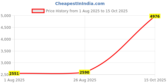 The current price is ₹4,976, which is ₹2,425 (95.1%) higher than the best price of ₹2,551 last seen on 1 Aug 2025. Over the 75 day price history period, prices have ranged from ₹2,551 to ₹4,976, with an average of ₹3,372. The pricing shows high volatility with significant fluctuations, but the overall trend is concerning as prices are getting more expensive. In terms of recent activity, there have been 0 price changes this week, 0 this month, and 2 over the past year. Consider waiting before making a purchase as prices are rising and better deals may be available later.