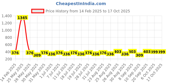 The current price is ₹399, which is ₹90 (29.1%) higher than the best price of ₹309 last seen on 30 May 2025. Over the 244 day price history period, prices have ranged from ₹309 to ₹1,345, with an average of ₹410. The pricing shows high volatility with significant fluctuations, but the overall trend is concerning as prices are getting more expensive. In terms of recent activity, there have been 0 price changes this week, 1 this month, and 19 over the past year. If you need this product now, it's a reasonable time to buy as prices are stable, but you might want to monitor for potential better deals.
