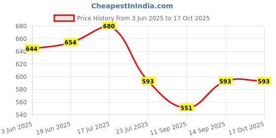 The current price is ₹593, which is ₹42 (7.6%) higher than the best price of ₹551 last seen on 11 Sep 2025. Over the 135 day price history period, prices have ranged from ₹551 to ₹680, with an average of ₹615. The pricing shows moderate volatility, and the overall trend is favorable for consumers as prices are getting cheaper. In terms of recent activity, there have been 0 price changes this week, 0 this month, and 5 over the past year. If you need this product now, it's a reasonable time to buy as prices are stable, but you might want to monitor for potential better deals.