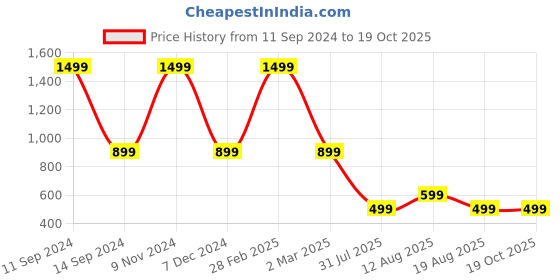 Exciting update! The current price of ₹499 is at its best ever level. Over the 402 day price history period, prices have ranged from ₹499 to ₹1,499, with an average of ₹929. The pricing shows high volatility with significant fluctuations, and the overall trend is favorable for consumers as prices are getting cheaper. In terms of recent activity, there have been 0 price changes this week, 0 this month, and 6 over the past year. If you need this product now, it's a reasonable time to buy as prices are stable, but you might want to monitor for potential better deals.