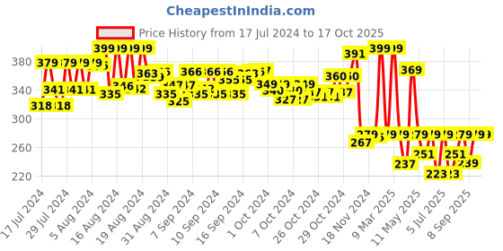 The current price is ₹279, which is ₹56 (25.1%) higher than the best price of ₹223 last seen on 25 Jun 2025. Over the 456 day price history period, prices have ranged from ₹223 to ₹399, with an average of ₹333. The pricing shows moderate volatility, and the overall trend is favorable for consumers as prices are getting cheaper. In terms of recent activity, there have been 0 price changes this week, 0 this month, and 26 over the past year. If you need this product now, it's a reasonable time to buy as prices are stable, but you might want to monitor for potential better deals.