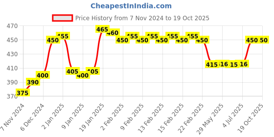 The current price is ₹450, which is ₹75 (20.0%) higher than the best price of ₹375 last seen on 7 Nov 2024. Over the 345 day price history period, prices have ranged from ₹375 to ₹465, with an average of ₹434. The pricing shows moderate volatility, but the overall trend is concerning as prices are getting more expensive. In terms of recent activity, there have been 0 price changes this week, 0 this month, and 23 over the past year. If you need this product now, it's a reasonable time to buy as prices are stable, but you might want to monitor for potential better deals.