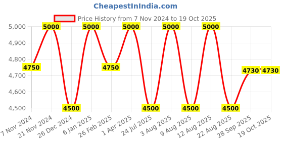 The current price is ₹4,730, which is ₹230 (5.1%) higher than the best price of ₹4,500 last seen on 26 Dec 2024. Over the 345 day price history period, prices have ranged from ₹4,500 to ₹5,000, with an average of ₹4,766. The pricing has been quite stable with low volatility, with prices remaining relatively stable overall. In terms of recent activity, there have been 0 price changes this week, 0 this month, and 11 over the past year. The price direction is uncertain, so monitor the situation for a few more days before making a decision.