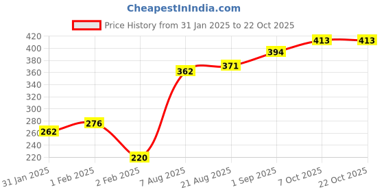 The current price is ₹413, which is ₹192.57 (87.4%) higher than the best price of ₹220.43 last seen on 2 Feb 2025. Over the 263 day price history period, prices have ranged from ₹220.43 to ₹413, with an average of ₹339. The pricing shows high volatility with significant fluctuations, but the overall trend is concerning as prices are getting more expensive. In terms of recent activity, there have been 0 price changes this week, 0 this month, and 6 over the past year. If you need this product now, it's a reasonable time to buy as prices are stable, but you might want to monitor for potential better deals.