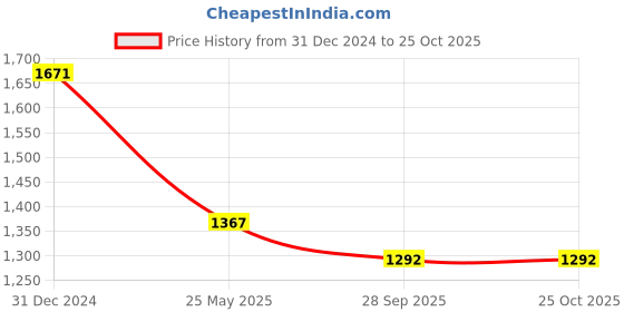 Awesome! The current price of ₹1,292 is at its best ever level. Over the 297 day price history period, prices have ranged from ₹1,292 to ₹1,671, with an average of ₹1,406. The pricing shows moderate volatility, and the overall trend is favorable for consumers as prices are getting cheaper. In terms of recent activity, there have been 0 price changes this week, 0 this month, and 2 over the past year. If you need this product now, it's a reasonable time to buy as prices are stable, but you might want to monitor for potential better deals.