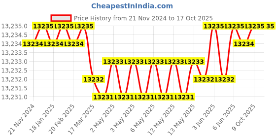 The current price is ₹13,235, which is ₹4 (0.0%) higher than the best price of ₹13,231 last seen on 22 Apr 2025. Over the 329 day price history period, prices have ranged from ₹13,231 to ₹13,235, with an average of ₹13,233. The pricing has been quite stable with low volatility, with prices remaining relatively stable overall. In terms of recent activity, there have been 0 price changes this week, 0 this month, and 22 over the past year. If you need this product now, it's a reasonable time to buy as prices are stable, but you might want to monitor for potential better deals.