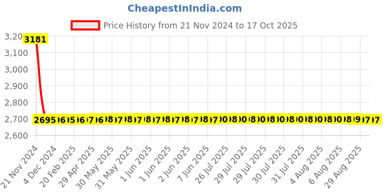 The current price is ₹2,697, which is ₹2 (0.1%) higher than the best price of ₹2,695 last seen on 21 Nov 2024. Over the 329 day price history period, prices have ranged from ₹2,695 to ₹3,181, with an average of ₹2,711. The pricing has been quite stable with low volatility, and the overall trend is favorable for consumers as prices are getting cheaper. In terms of recent activity, there have been 0 price changes this week, 0 this month, and 34 over the past year. If you need this product now, it's a reasonable time to buy as prices are stable, but you might want to monitor for potential better deals.