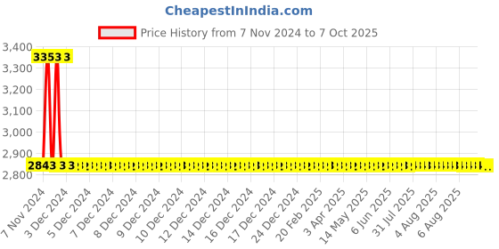 Awesome! The current price of ₹2,841 is at its best ever level. Over the 333 day price history period, prices have ranged from ₹2,841 to ₹3,353, with an average of ₹2,853. The pricing has been quite stable with low volatility, with prices remaining relatively stable overall. In terms of recent activity, there have been 0 price changes this week, 0 this month, and 93 over the past year. If you need this product now, it's a reasonable time to buy as prices are stable, but you might want to monitor for potential better deals.
