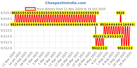 The current price is ₹9,514, which is ₹2 (0.0%) higher than the best price of ₹9,512 last seen on 6 May 2025. Over the 339 day price history period, prices have ranged from ₹9,512 to ₹9,515, with an average of ₹9,514. The pricing has been quite stable with low volatility, with prices remaining relatively stable overall. In terms of recent activity, there have been 0 price changes this week, 6 this month, and 99 over the past year. If you need this product now, it's a reasonable time to buy as prices are stable, but you might want to monitor for potential better deals.