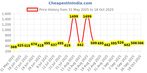 The current price is ₹506, which is ₹138 (37.5%) higher than the best price of ₹368 last seen on 31 May 2025. Over the 140 day price history period, prices have ranged from ₹368 to ₹1,499, with an average of ₹565. The pricing shows high volatility with significant fluctuations, but the overall trend is concerning as prices are getting more expensive. In terms of recent activity, there have been 0 price changes this week, 0 this month, and 18 over the past year. If you need this product now, it's a reasonable time to buy as prices are stable, but you might want to monitor for potential better deals.