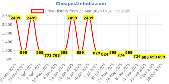 The current price is ₹699, which is ₹14 (2.0%) higher than the best price of ₹685 last seen on 23 Sep 2025. Over the 209 day price history period, prices have ranged from ₹685 to ₹2,499, with an average of ₹1,169. The pricing shows high volatility with significant fluctuations, and the overall trend is favorable for consumers as prices are getting cheaper. In terms of recent activity, there have been 0 price changes this week, 1 this month, and 17 over the past year. If you need this product now, it's a reasonable time to buy as prices are stable, but you might want to monitor for potential better deals.