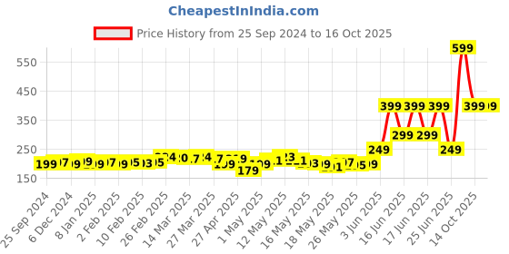 The current price is ₹399, which is ₹220 (122.9%) higher than the best price of ₹179 last seen on 29 Apr 2025. Over the 386 day price history period, prices have ranged from ₹179 to ₹599, with an average of ₹249. The pricing shows high volatility with significant fluctuations, but the overall trend is concerning as prices are getting more expensive. In terms of recent activity, there have been 0 price changes this week, 1 this month, and 35 over the past year. The price direction is uncertain, so monitor the situation for a few more days before making a decision.