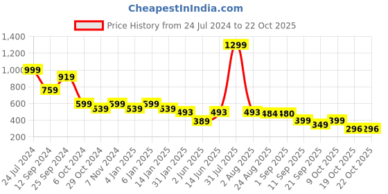 Good news! The current price of ₹296 is at its best ever level. Over the 454 day price history period, prices have ranged from ₹296 to ₹1,299, with an average of ₹570. The pricing shows high volatility with significant fluctuations, and the overall trend is favorable for consumers as prices are getting cheaper. In terms of recent activity, there have been 0 price changes this week, 1 this month, and 15 over the past year. This is an excellent time to make a purchase as prices are trending downward and conditions appear favorable.