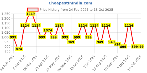 The current price is ₹899, which is ₹25 (2.9%) higher than the best price of ₹874 last seen on 1 Mar 2025. Over the 236 day price history period, prices have ranged from ₹874 to ₹1,249, with an average of ₹1,023. The pricing shows moderate volatility, and the overall trend is favorable for consumers as prices are getting cheaper. In terms of recent activity, there have been 0 price changes this week, 2 this month, and 21 over the past year. This is an excellent time to make a purchase as prices are trending downward and conditions appear favorable.