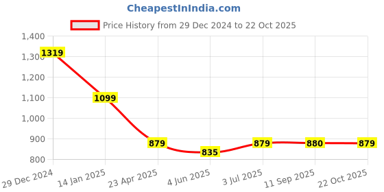 The current price is ₹879, which is ₹44 (5.3%) higher than the best price of ₹835 last seen on 4 Jun 2025. Over the 297 day price history period, prices have ranged from ₹835 to ₹1,319, with an average of ₹967. The pricing shows high volatility with significant fluctuations, and the overall trend is favorable for consumers as prices are getting cheaper. In terms of recent activity, there have been 0 price changes this week, 0 this month, and 6 over the past year. If you need this product now, it's a reasonable time to buy as prices are stable, but you might want to monitor for potential better deals.