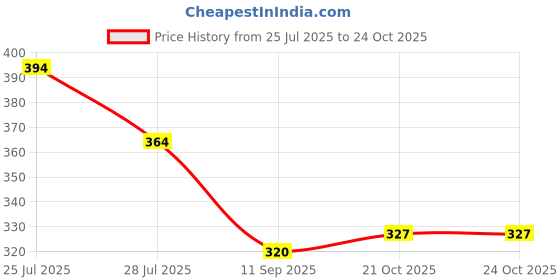 The current price is ₹327, which is ₹7 (2.2%) higher than the best price of ₹320 last seen on 11 Sep 2025. Over the 91 day price history period, prices have ranged from ₹320 to ₹394, with an average of ₹346. The pricing shows moderate volatility, and the overall trend is favorable for consumers as prices are getting cheaper. In terms of recent activity, there have been 0 price changes this week, 0 this month, and 3 over the past year. If you need this product now, it's a reasonable time to buy as prices are stable, but you might want to monitor for potential better deals.