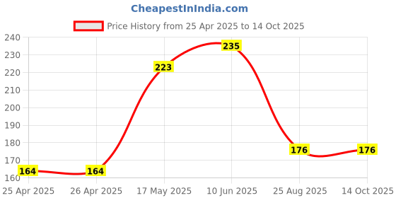 The current price is ₹176, which is ₹12 (7.3%) higher than the best price of ₹164 last seen on 26 Apr 2025. Over the 171 day price history period, prices have ranged from ₹164 to ₹235, with an average of ₹190. The pricing shows moderate volatility, but the overall trend is concerning as prices are getting more expensive. In terms of recent activity, there have been 0 price changes this week, 0 this month, and 4 over the past year. If you need this product now, it's a reasonable time to buy as prices are stable, but you might want to monitor for potential better deals.