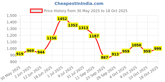 The current price is ₹959, which is ₹92 (10.6%) higher than the best price of ₹867 last seen on 23 Sep 2025. Over the 141 day price history period, prices have ranged from ₹867 to ₹1,452, with an average of ₹1,071. The pricing shows high volatility with significant fluctuations, with prices remaining relatively stable overall. In terms of recent activity, there have been 0 price changes this week, 4 this month, and 12 over the past year. If you need this product now, it's a reasonable time to buy as prices are stable, but you might want to monitor for potential better deals.