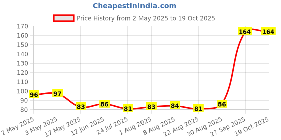 The current price is ₹164, which is ₹83 (102.5%) higher than the best price of ₹81 last seen on 24 Jul 2025. Over the 169 day price history period, prices have ranged from ₹81 to ₹164, with an average of ₹101. The pricing shows high volatility with significant fluctuations, but the overall trend is concerning as prices are getting more expensive. In terms of recent activity, there have been 0 price changes this week, 0 this month, and 9 over the past year. If you need this product now, it's a reasonable time to buy as prices are stable, but you might want to monitor for potential better deals.
