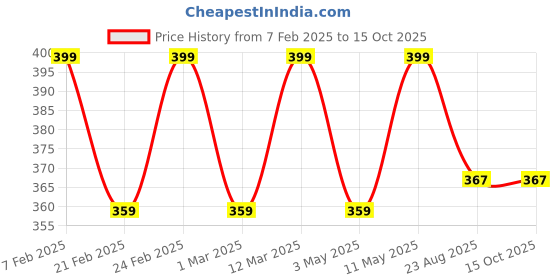 The current price is ₹367, which is ₹8 (2.2%) higher than the best price of ₹359 last seen on 21 Feb 2025. Over the 249 day price history period, prices have ranged from ₹359 to ₹399, with an average of ₹379. The pricing has been quite stable with low volatility, and the overall trend is favorable for consumers as prices are getting cheaper. In terms of recent activity, there have been 0 price changes this week, 0 this month, and 7 over the past year. If you need this product now, it's a reasonable time to buy as prices are stable, but you might want to monitor for potential better deals.