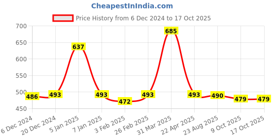 The current price is ₹479, which is ₹7 (1.5%) higher than the best price of ₹472 last seen on 3 Feb 2025. Over the 314 day price history period, prices have ranged from ₹472 to ₹685, with an average of ₹518. The pricing shows moderate volatility, with prices remaining relatively stable overall. In terms of recent activity, there have been 0 price changes this week, 0 this month, and 9 over the past year. If you need this product now, it's a reasonable time to buy as prices are stable, but you might want to monitor for potential better deals.
