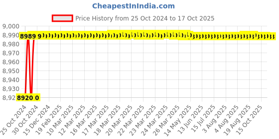 The current price is ₹8,988, which is ₹68 (0.8%) higher than the best price of ₹8,920 last seen on 25 Oct 2024. Over the 356 day price history period, prices have ranged from ₹8,920 to ₹8,991, with an average of ₹8,988. The pricing has been quite stable with low volatility, with prices remaining relatively stable overall. In terms of recent activity, there has been 1 price change this week, 3 this month, and 81 over the past year. If you need this product now, it's a reasonable time to buy as prices are stable, but you might want to monitor for potential better deals.