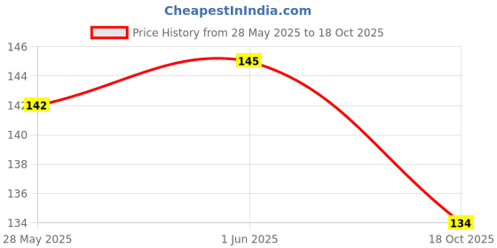 Awesome! The current price of ₹134 is at its best ever level. Over the 143 day price history period, prices have ranged from ₹134 to ₹145, with an average of ₹140. The pricing has been quite stable with low volatility, and the overall trend is favorable for consumers as prices are getting cheaper. In terms of recent activity, there have been 0 price changes this week, 0 this month, and 2 over the past year. If you need this product now, it's a reasonable time to buy as prices are stable, but you might want to monitor for potential better deals.