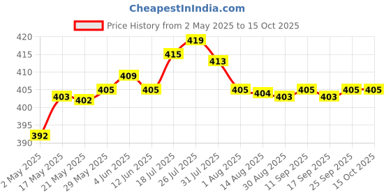 The current price is ₹405, which is ₹13 (3.3%) higher than the best price of ₹392 last seen on 2 May 2025. Over the 165 day price history period, prices have ranged from ₹392 to ₹419, with an average of ₹406. The pricing has been quite stable with low volatility, with prices remaining relatively stable overall. In terms of recent activity, there have been 0 price changes this week, 1 this month, and 14 over the past year. If you need this product now, it's a reasonable time to buy as prices are stable, but you might want to monitor for potential better deals.
