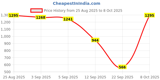 The current price is ₹1,295, which is ₹729 (128.8%) higher than the best price of ₹566 last seen on 22 Sep 2025. Over the 44 day price history period, prices have ranged from ₹566 to ₹1,295, with an average of ₹1,102. The pricing shows high volatility with significant fluctuations, with prices remaining relatively stable overall. In terms of recent activity, there have been 0 price changes this week, 2 this month, and 5 over the past year. The price direction is uncertain, so monitor the situation for a few more days before making a decision.