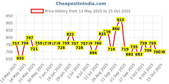 The current price is ₹700, which is ₹45 (6.9%) higher than the best price of ₹655 last seen on 14 May 2025. Over the 154 day price history period, prices have ranged from ₹655 to ₹923, with an average of ₹753. The pricing shows moderate volatility, and the overall trend is favorable for consumers as prices are getting cheaper. In terms of recent activity, there has been 1 price change this week, 8 this month, and 31 over the past year. If you need this product now, it's a reasonable time to buy as prices are stable, but you might want to monitor for potential better deals.