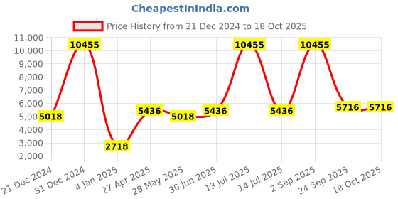 The current price is ₹5,716, which is ₹2,998 (110.3%) higher than the best price of ₹2,718 last seen on 4 Jan 2025. Over the 301 day price history period, prices have ranged from ₹2,718 to ₹10,455, with an average of ₹6,533. The pricing shows high volatility with significant fluctuations, but the overall trend is concerning as prices are getting more expensive. In terms of recent activity, there have been 0 price changes this week, 0 this month, and 9 over the past year. The price direction is uncertain, so monitor the situation for a few more days before making a decision.