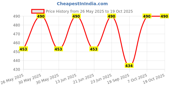 The current price is ₹490, which is ₹56 (12.9%) higher than the best price of ₹434 last seen on 19 Sep 2025. Over the 145 day price history period, prices have ranged from ₹434 to ₹490, with an average of ₹471. The pricing has been quite stable with low volatility, but the overall trend is concerning as prices are getting more expensive. In terms of recent activity, there have been 0 price changes this week, 1 this month, and 7 over the past year. If you need this product now, it's a reasonable time to buy as prices are stable, but you might want to monitor for potential better deals.