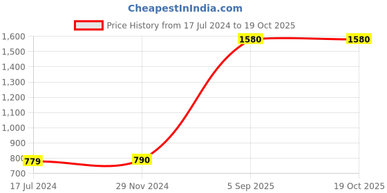 The current price is ₹1,580, which is ₹801 (102.8%) higher than the best price of ₹779 last seen on 17 Jul 2024. Over the 458 day price history period, prices have ranged from ₹779 to ₹1,580, with an average of ₹1,182. The pricing shows high volatility with significant fluctuations, but the overall trend is concerning as prices are getting more expensive. In terms of recent activity, there have been 0 price changes this week, 0 this month, and 1 over the past year. Consider waiting before making a purchase as prices are rising and better deals may be available later.