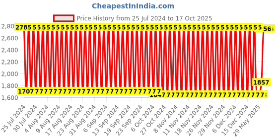 The current price is ₹2,756, which is ₹1,108.75 (67.3%) higher than the best price of ₹1,647.25 last seen on 25 Oct 2024. Over the 448 day price history period, prices have ranged from ₹1,647.25 to ₹2,785.35, with an average of ₹2,234. The pricing shows high volatility with significant fluctuations, with prices remaining relatively stable overall. In terms of recent activity, there have been 0 price changes this week, 0 this month, and 45 over the past year. The price direction is uncertain, so monitor the situation for a few more days before making a decision.