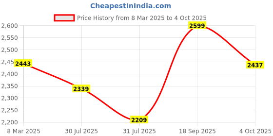 The current price is ₹2,437, which is ₹228 (10.3%) higher than the best price of ₹2,209 last seen on 31 Jul 2025. Over the 210 day price history period, prices have ranged from ₹2,209 to ₹2,599, with an average of ₹2,405. The pricing shows moderate volatility, with prices remaining relatively stable overall. In terms of recent activity, there have been 0 price changes this week, 0 this month, and 4 over the past year. The price direction is uncertain, so monitor the situation for a few more days before making a decision.