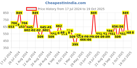 The current price is ₹568, which is ₹169 (42.4%) higher than the best price of ₹399 last seen on 1 Mar 2025. Over the 458 day price history period, prices have ranged from ₹399 to ₹849, with an average of ₹595. The pricing shows high volatility with significant fluctuations, and the overall trend is favorable for consumers as prices are getting cheaper. In terms of recent activity, there have been 0 price changes this week, 4 this month, and 22 over the past year. This is an excellent time to make a purchase as prices are trending downward and conditions appear favorable.