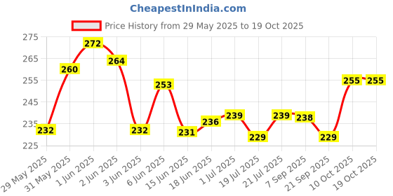 The current price is ₹255, which is ₹26 (11.4%) higher than the best price of ₹229 last seen on 19 Jul 2025. Over the 142 day price history period, prices have ranged from ₹229 to ₹272, with an average of ₹244. The pricing shows moderate volatility, but the overall trend is concerning as prices are getting more expensive. In terms of recent activity, there have been 0 price changes this week, 1 this month, and 13 over the past year. If you need this product now, it's a reasonable time to buy as prices are stable, but you might want to monitor for potential better deals.