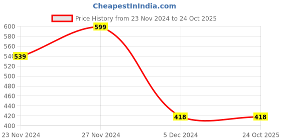 Good news! The current price of ₹418 is at its best ever level. Over the 335 day price history period, prices have ranged from ₹418 to ₹599, with an average of ₹494. The pricing shows high volatility with significant fluctuations, and the overall trend is favorable for consumers as prices are getting cheaper. In terms of recent activity, there have been 0 price changes this week, 0 this month, and 2 over the past year. This is an excellent time to make a purchase as prices are trending downward and conditions appear favorable.