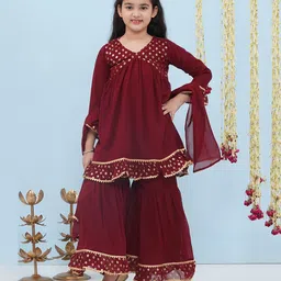 AJ Dezines Three Fourth Sleeves Printed Anarkali Kurta Sharara Set - Maroon