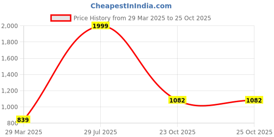 The current price is ₹1,082, which is ₹243 (29.0%) higher than the best price of ₹839 last seen on 29 Mar 2025. Over the 209 day price history period, prices have ranged from ₹839 to ₹1,999, with an average of ₹1,251. The pricing shows high volatility with significant fluctuations, but the overall trend is concerning as prices are getting more expensive. In terms of recent activity, there have been 0 price changes this week, 0 this month, and 2 over the past year. The price direction is uncertain, so monitor the situation for a few more days before making a decision.