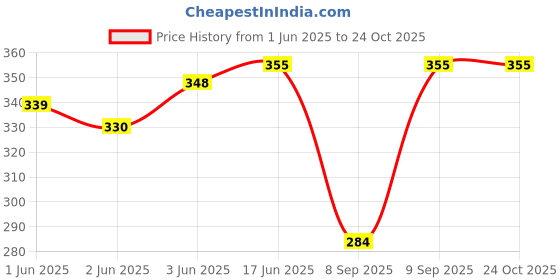 The current price is ₹355, which is ₹71 (25.0%) higher than the best price of ₹284 last seen on 8 Sep 2025. Over the 145 day price history period, prices have ranged from ₹284 to ₹355, with an average of ₹338. The pricing shows moderate volatility, with prices remaining relatively stable overall. In terms of recent activity, there have been 0 price changes this week, 0 this month, and 5 over the past year. If you need this product now, it's a reasonable time to buy as prices are stable, but you might want to monitor for potential better deals.