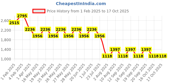 Good news! The current price of ₹1,118 is at its best ever level. Over the 257 day price history period, prices have ranged from ₹1,118 to ₹2,795, with an average of ₹1,803. The pricing shows high volatility with significant fluctuations, and the overall trend is favorable for consumers as prices are getting cheaper. In terms of recent activity, there have been 0 price changes this week, 2 this month, and 18 over the past year. This is an excellent time to make a purchase as prices are trending downward and conditions appear favorable.