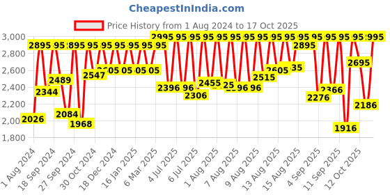 The current price is ₹2,995, which is ₹1,079 (56.3%) higher than the best price of ₹1,916 last seen on 20 Sep 2025. Over the 442 day price history period, prices have ranged from ₹1,916 to ₹2,995, with an average of ₹2,681. The pricing shows moderate volatility, but the overall trend is concerning as prices are getting more expensive. In terms of recent activity, there have been 2 price changes this week, 4 this month, and 41 over the past year. Consider waiting before making a purchase as prices are rising and better deals may be available later.