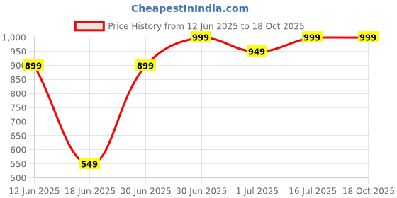 The current price is ₹999, which is ₹450 (82.0%) higher than the best price of ₹549 last seen on 18 Jun 2025. Over the 128 day price history period, prices have ranged from ₹549 to ₹999, with an average of ₹899. The pricing shows high volatility with significant fluctuations, but the overall trend is concerning as prices are getting more expensive. In terms of recent activity, there have been 0 price changes this week, 0 this month, and 5 over the past year. If you need this product now, it's a reasonable time to buy as prices are stable, but you might want to monitor for potential better deals.