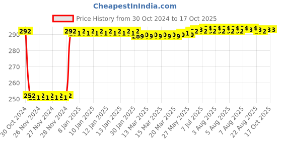The current price is ₹293, which is ₹42 (16.7%) higher than the best price of ₹251 last seen on 7 Nov 2024. Over the 351 day price history period, prices have ranged from ₹251 to ₹294, with an average of ₹285. The pricing shows moderate volatility, with prices remaining relatively stable overall. In terms of recent activity, there have been 0 price changes this week, 1 this month, and 53 over the past year. If you need this product now, it's a reasonable time to buy as prices are stable, but you might want to monitor for potential better deals.