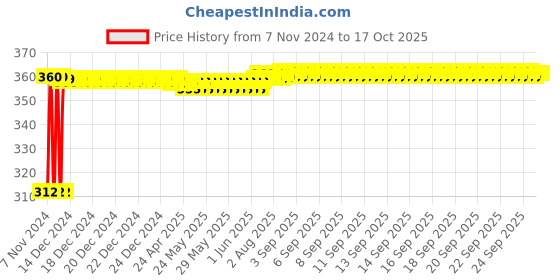 The current price is ₹361, which is ₹49 (15.7%) higher than the best price of ₹312 last seen on 7 Nov 2024. Over the 343 day price history period, prices have ranged from ₹312 to ₹362, with an average of ₹359. The pricing has been quite stable with low volatility, but the overall trend is concerning as prices are getting more expensive. In terms of recent activity, there have been 0 price changes this week, 29 this month, and 150 over the past year. If you need this product now, it's a reasonable time to buy as prices are stable, but you might want to monitor for potential better deals.