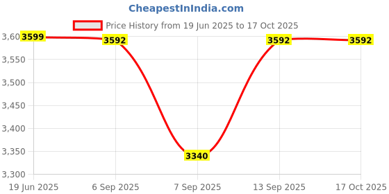 The current price is ₹3,592, which is ₹252 (7.5%) higher than the best price of ₹3,340 last seen on 7 Sep 2025. Over the 119 day price history period, prices have ranged from ₹3,340 to ₹3,599, with an average of ₹3,543. The pricing has been quite stable with low volatility, with prices remaining relatively stable overall. In terms of recent activity, there have been 0 price changes this week, 0 this month, and 3 over the past year. The price direction is uncertain, so monitor the situation for a few more days before making a decision.