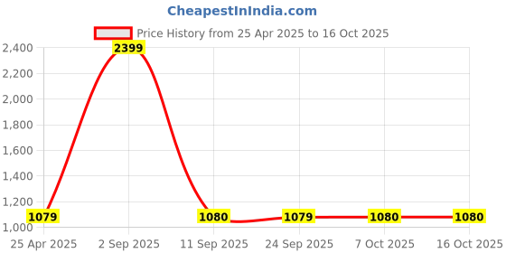 The current price is ₹1,080, which is ₹1 (0.1%) higher than the best price of ₹1,079 last seen on 25 Apr 2025. Over the 174 day price history period, prices have ranged from ₹1,079 to ₹2,399, with an average of ₹1,300. The pricing shows high volatility with significant fluctuations, with prices remaining relatively stable overall. In terms of recent activity, there have been 0 price changes this week, 1 this month, and 4 over the past year. If you need this product now, it's a reasonable time to buy as prices are stable, but you might want to monitor for potential better deals.